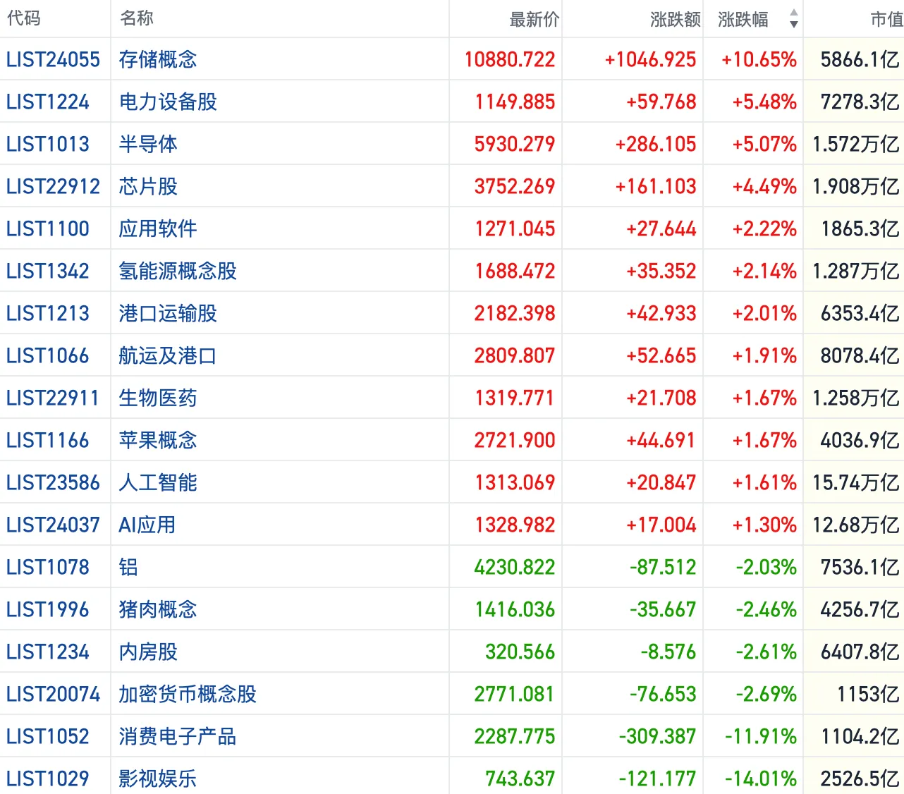 其他方向上,大模型、存储、芯片、光通信等AI相关方向集体走强。医药、煤炭、电力、贵金属等板块也相对活跃。