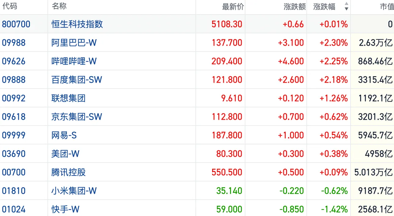 盘面上,今日大型科网股多数上扬,算力涨价潮带动阿里、百度大涨逾2%,京东、美团、腾讯集体跟涨,小米、快手飘绿。